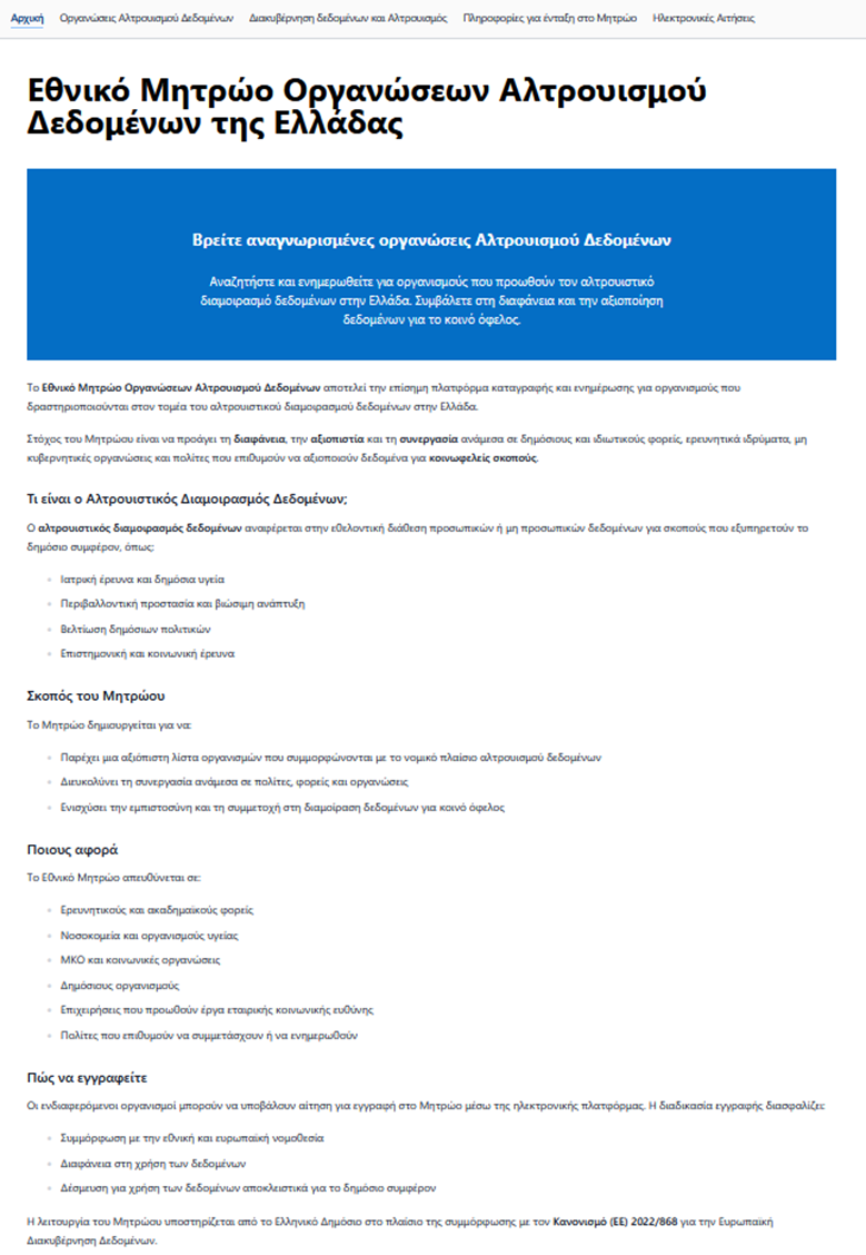 Στην αρχική σελίδα της ιστοσελίδας, παρουσιάζονται γενικές πληροφορίες για το Μητρώο Οργανώσεων Αλτρουισμού Δεδομένων.&#x20;