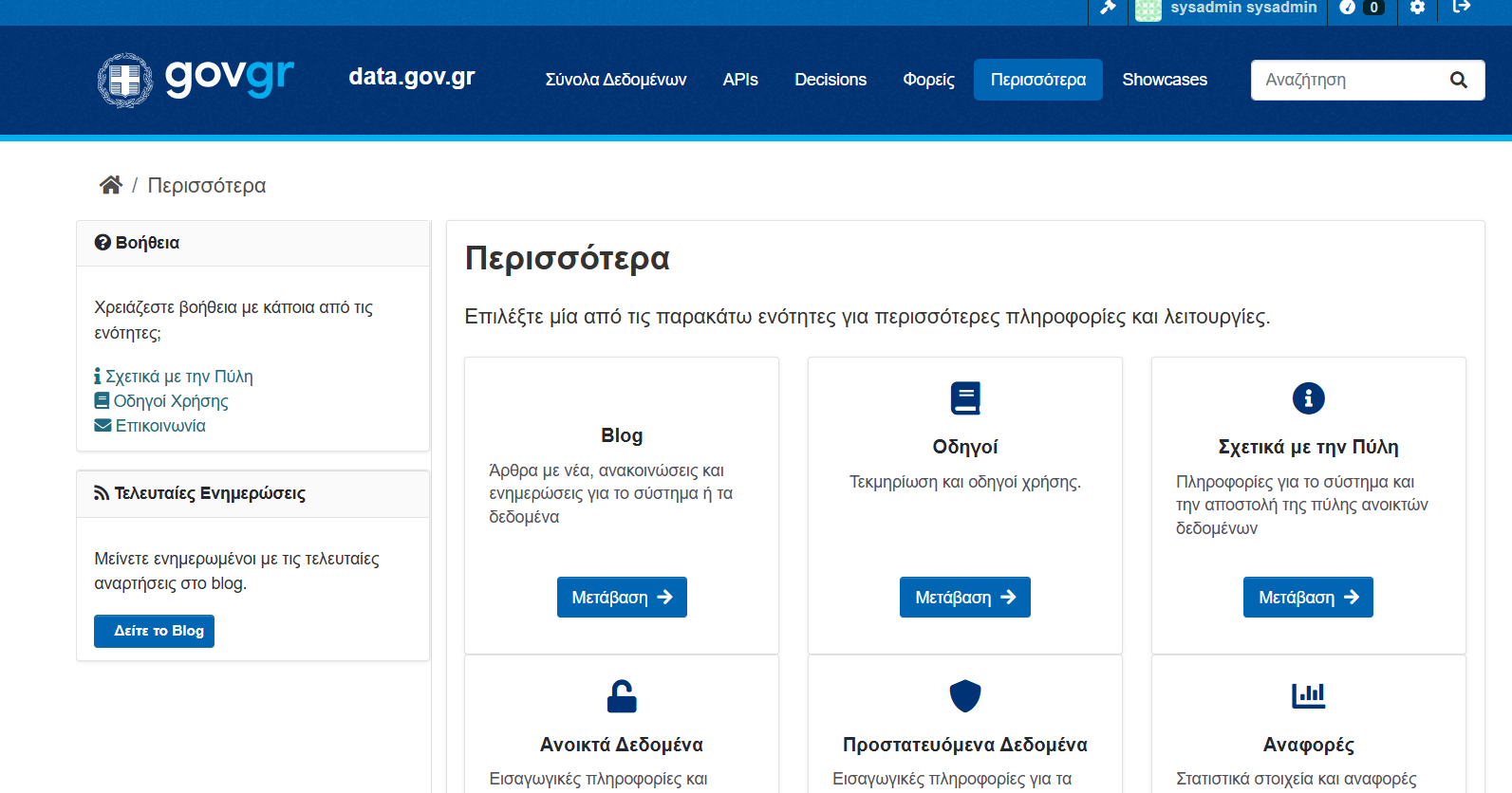 Θα μεταφερθείτε σε διακριτή σελίδα με τις βασικές ενότητες περιεχομένου (Blog, Οδηγοί, About, Ανοιχτά Δεδομένα, Προστατευόμενα Δεδομένα).&#x20;